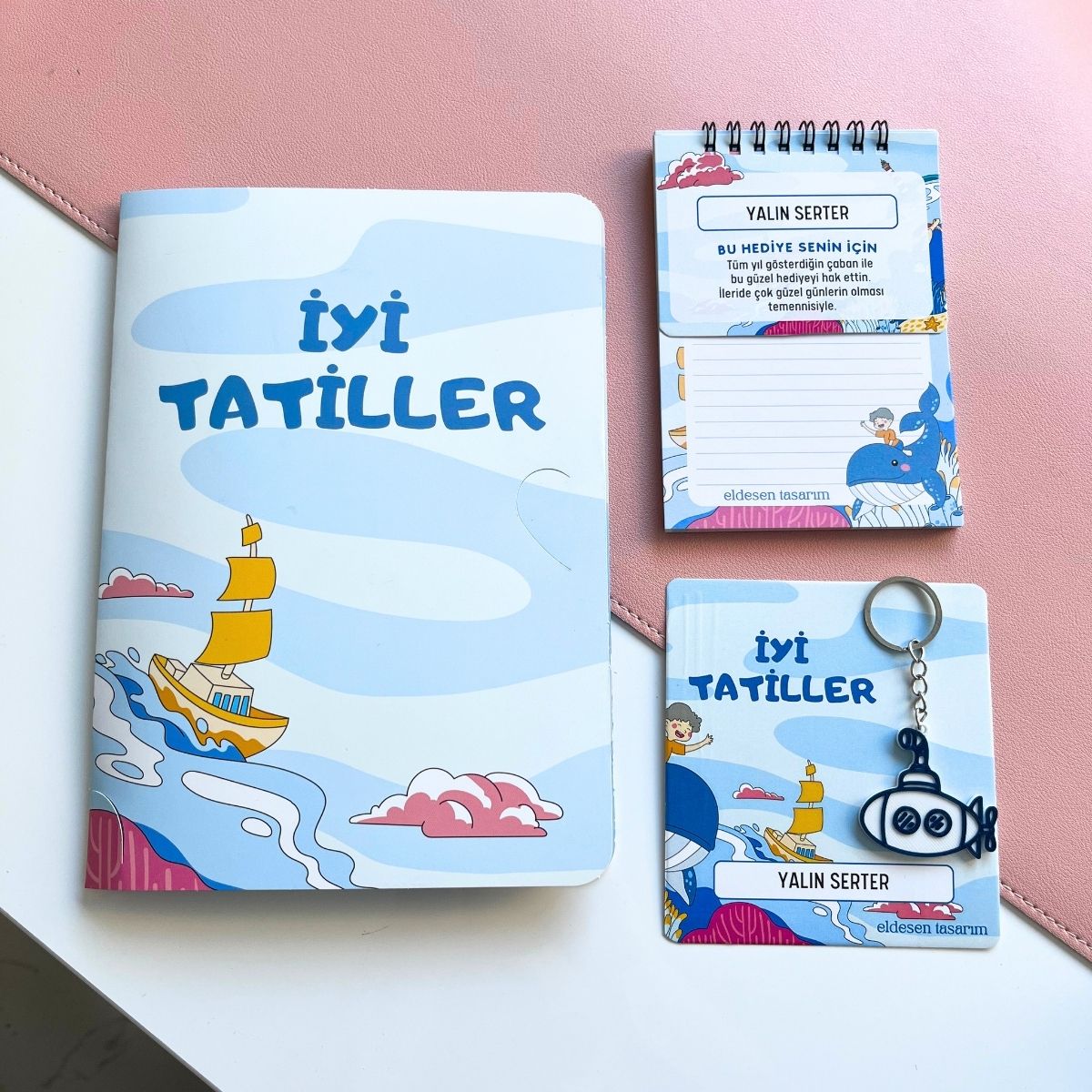 İsme özel defter, anahtarlık ve karne kılıflı içermektedir.
