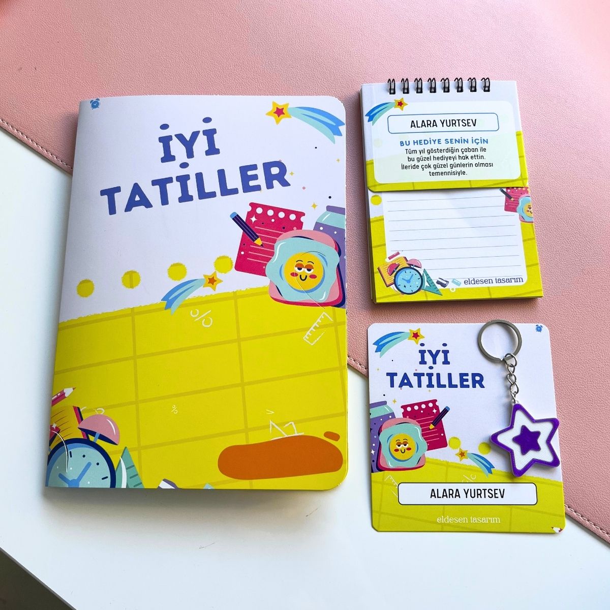 İsme özel defter, anahtarlık ve karne kılıflı içermektedir.